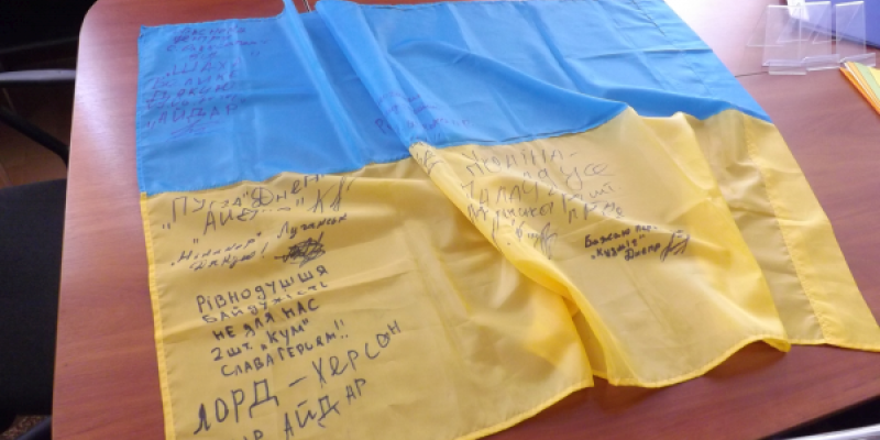 За допомогу і підтримку воїнів АТО слухачами Рівненського центру професійно-технічної освіти Державної служби зайнятості представник ГО «Гроза Рівненщини» Олександр Кочубей передав завідувачу Олександрійського навчального відділення Олександру Сидорцю символічне українське знамено, розписане словами подяки.